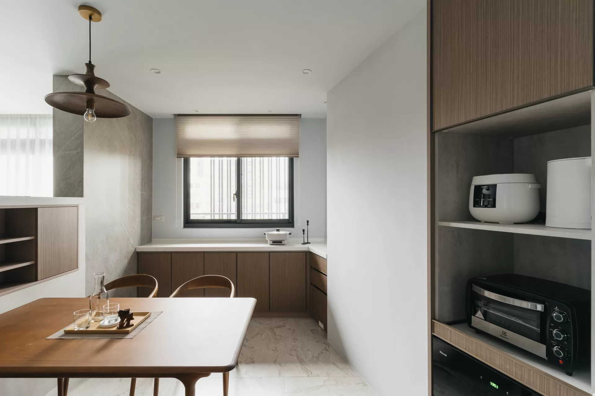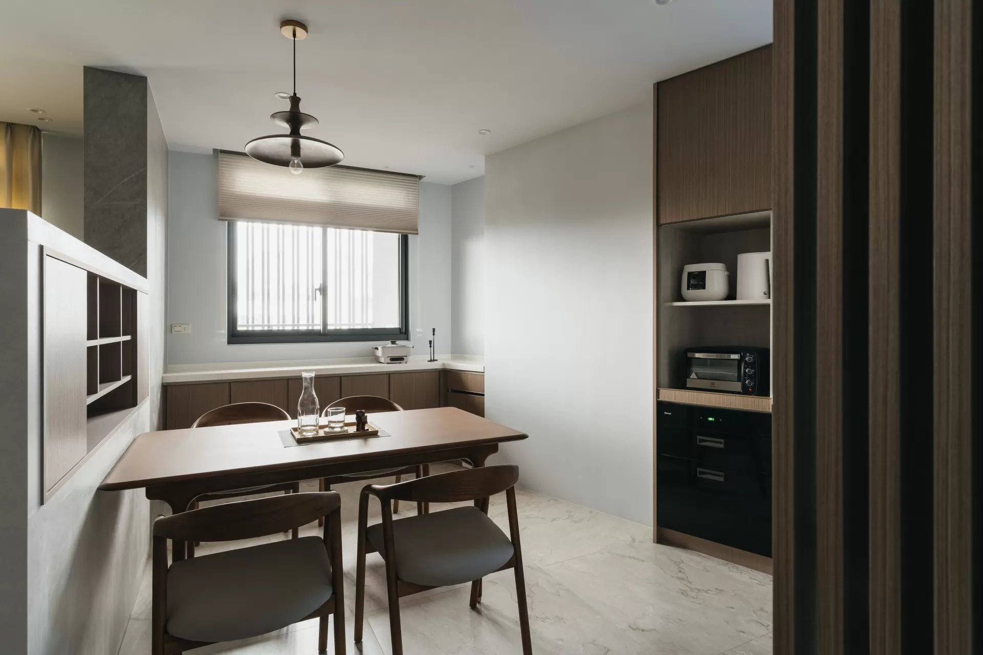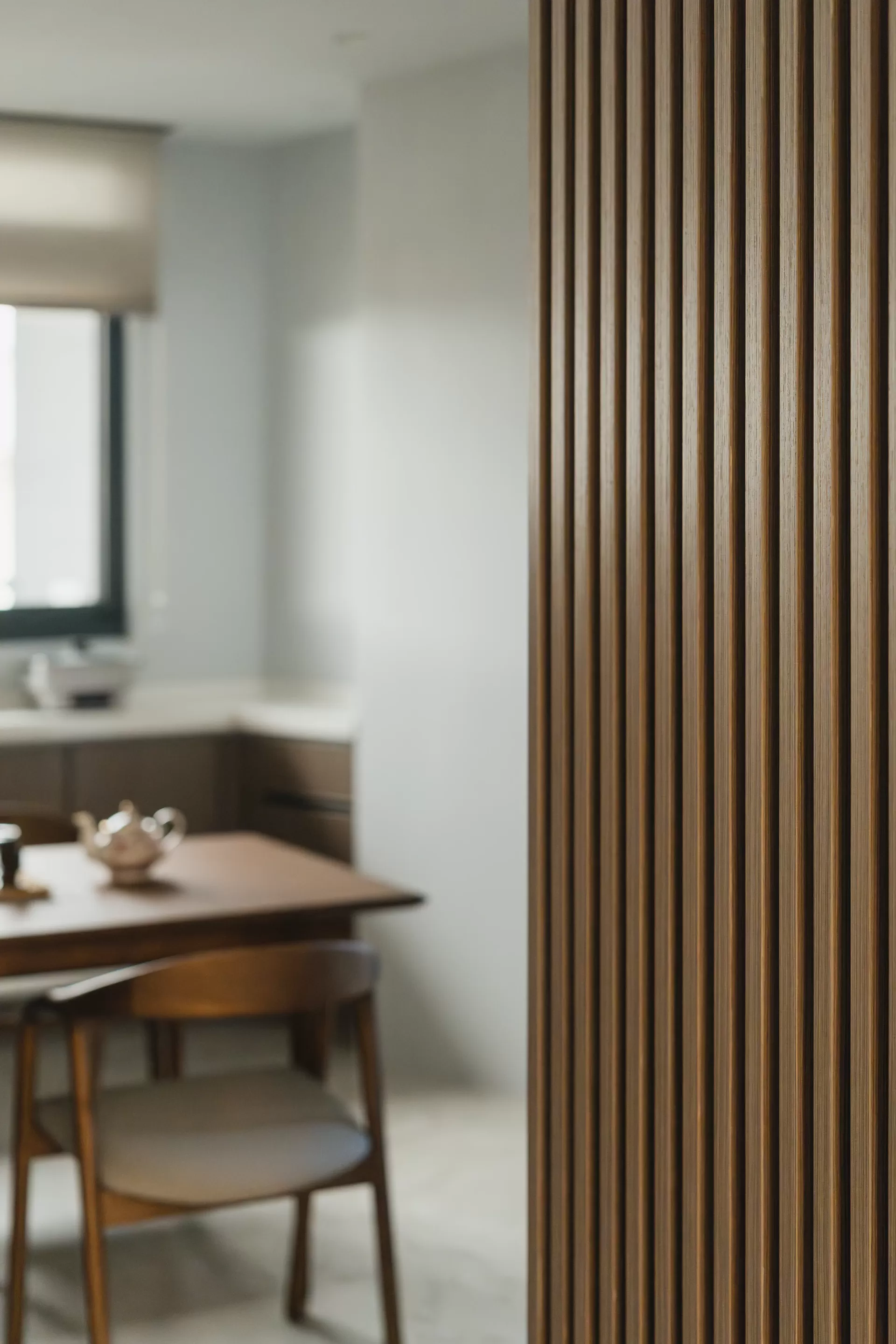 他方,隔絕喧囂的靜謐空間。 石材地板和牆壁的紋理映照了大自然的肌理,並為空間打下柔和的基礎。格柵作為一道會呼吸的牆,為空間帶來難得的私密感。而燈具作為空間中的點綴,則提供空間細節上的呈現。