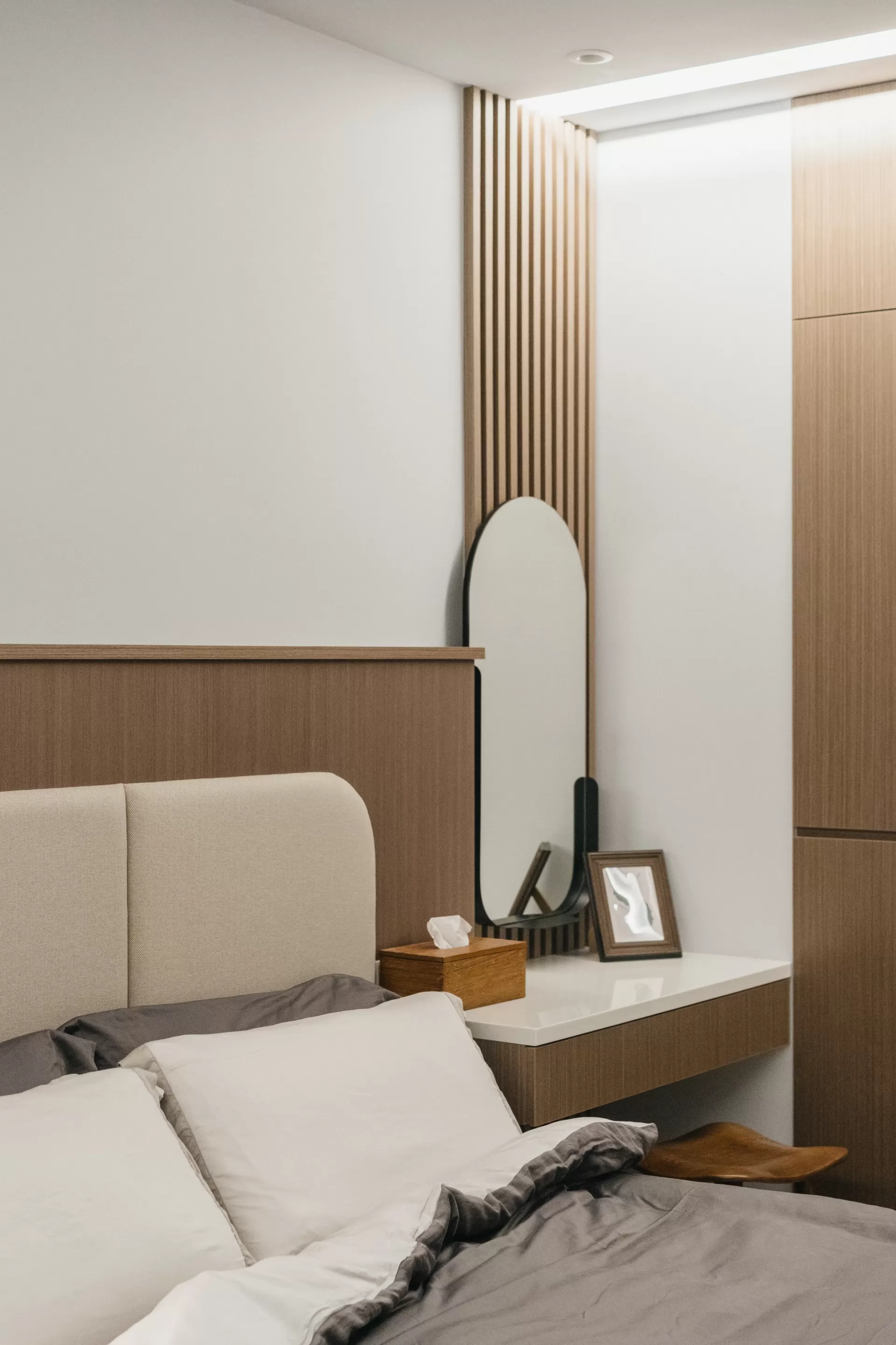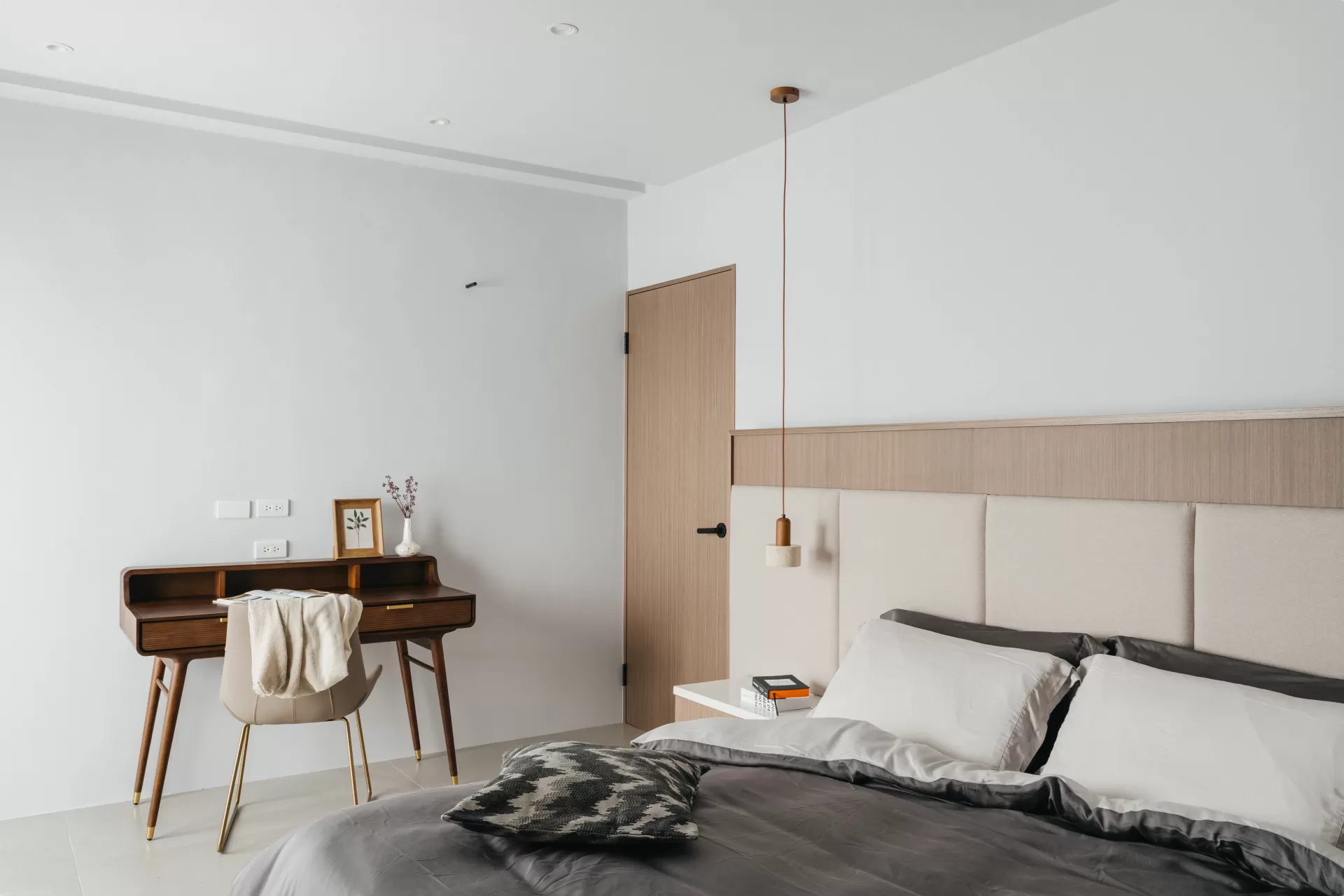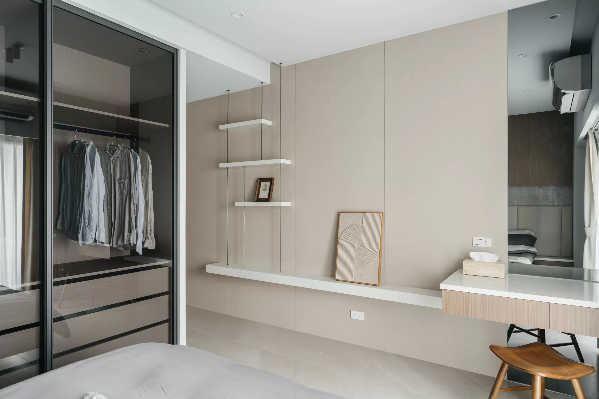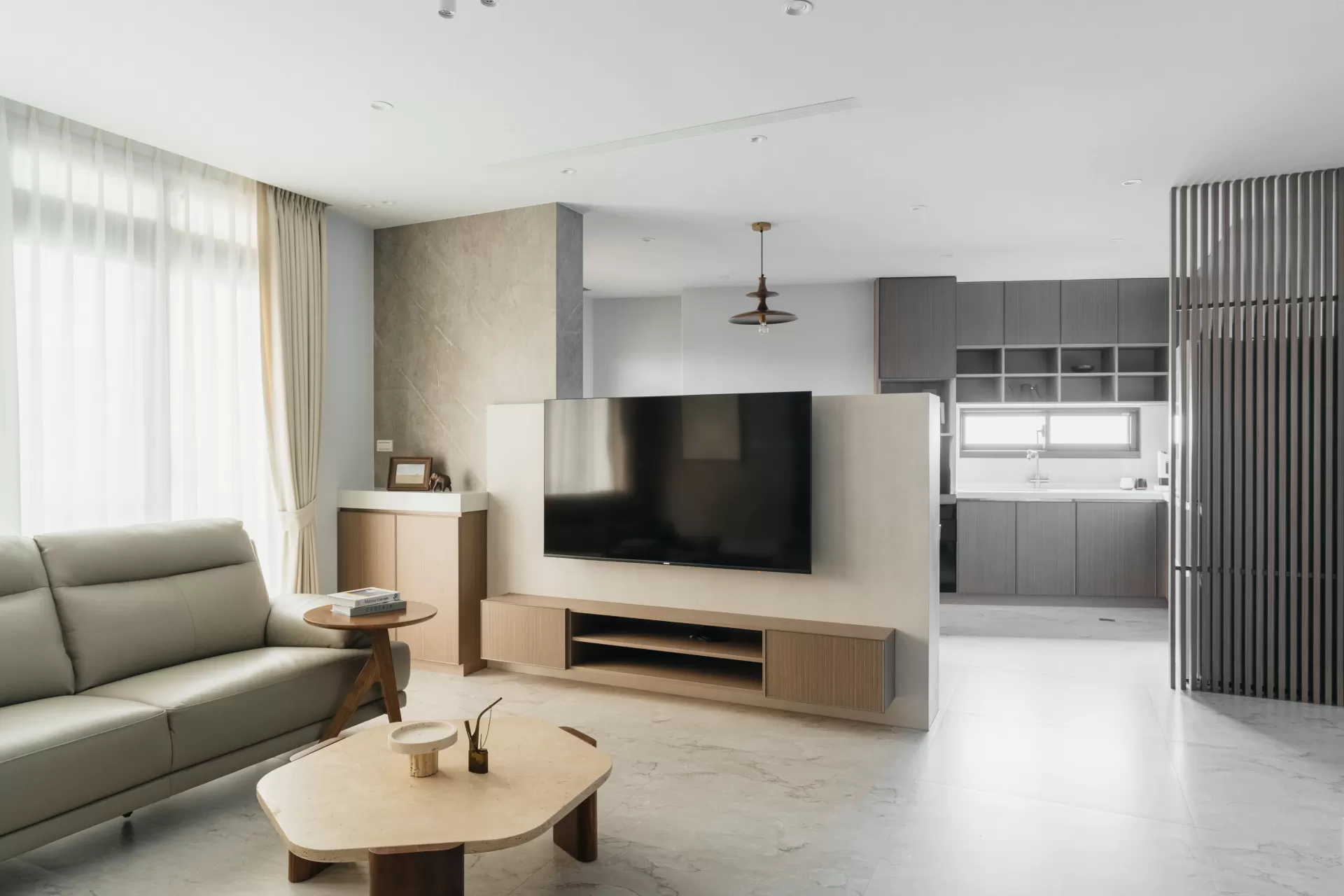 他方,隔絕喧囂的靜謐空間。 石材地板和牆壁的紋理映照了大自然的肌理,並為空間打下柔和的基礎。格柵作為一道會呼吸的牆,為空間帶來難得的私密感。而燈具作為空間中的點綴,則提供空間細節上的呈現。