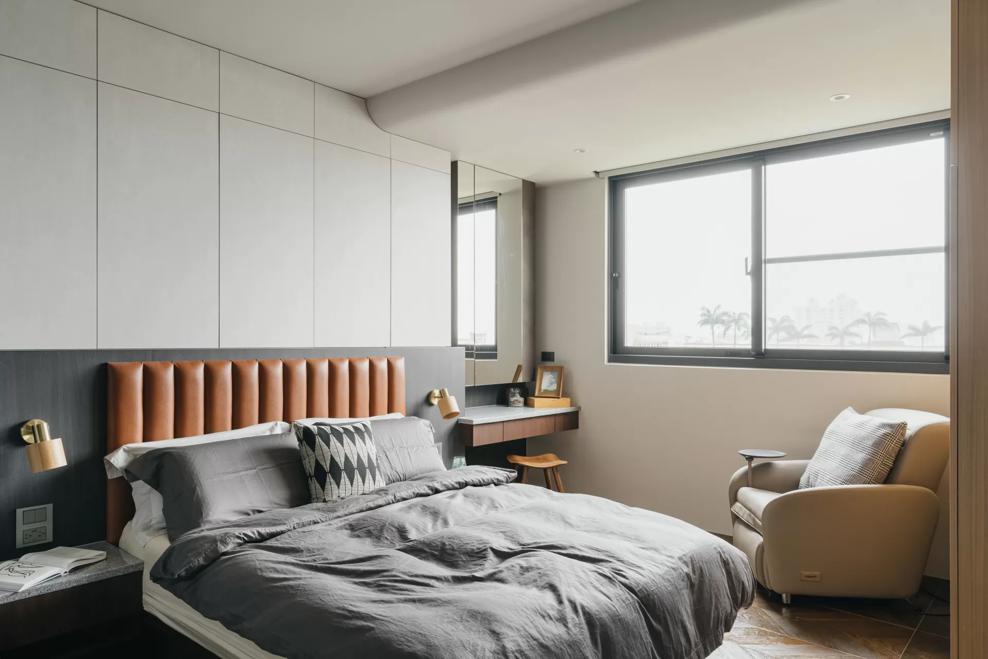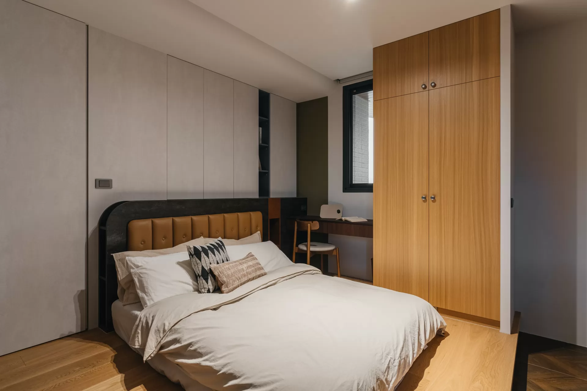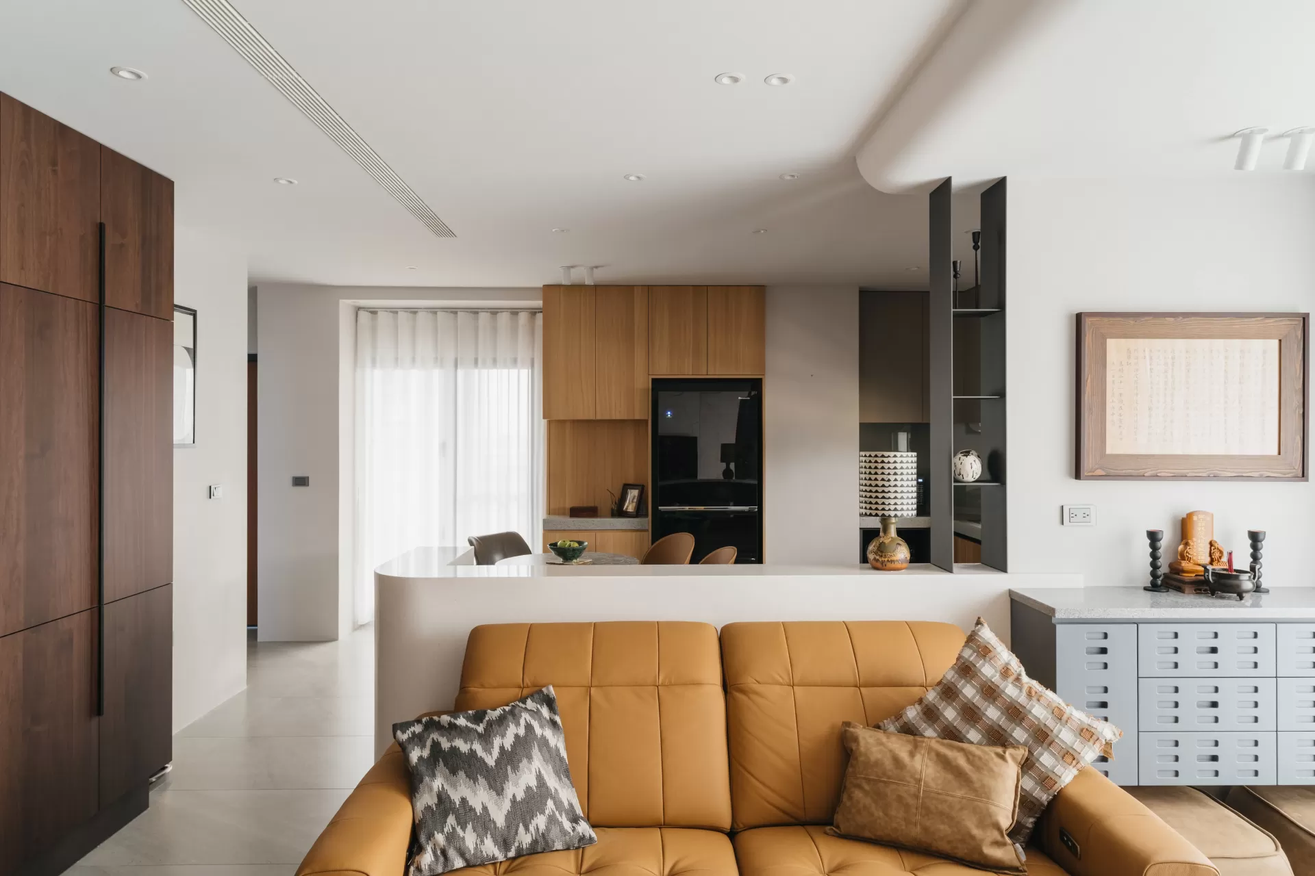 廓形,點線面構築的生活空間。鐵件、深淺色木作、人造石、大板磚...多元材質的交織為空間帶來了感官上的動態聯想。當代形式的祭壇,讓新舊兩代更輕鬆地展開對話。而臥室中的深色木板和橙色皮質床頭則為空間持續增添了動態的氣息。