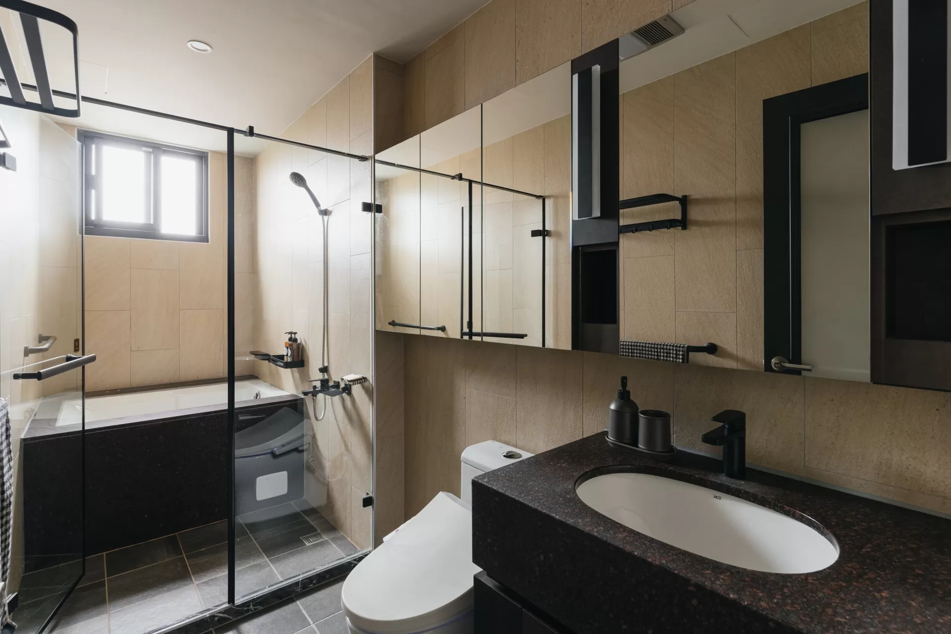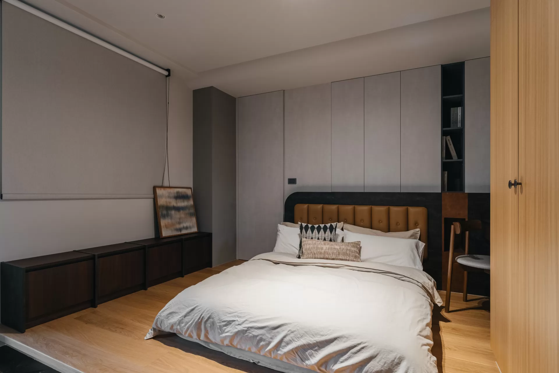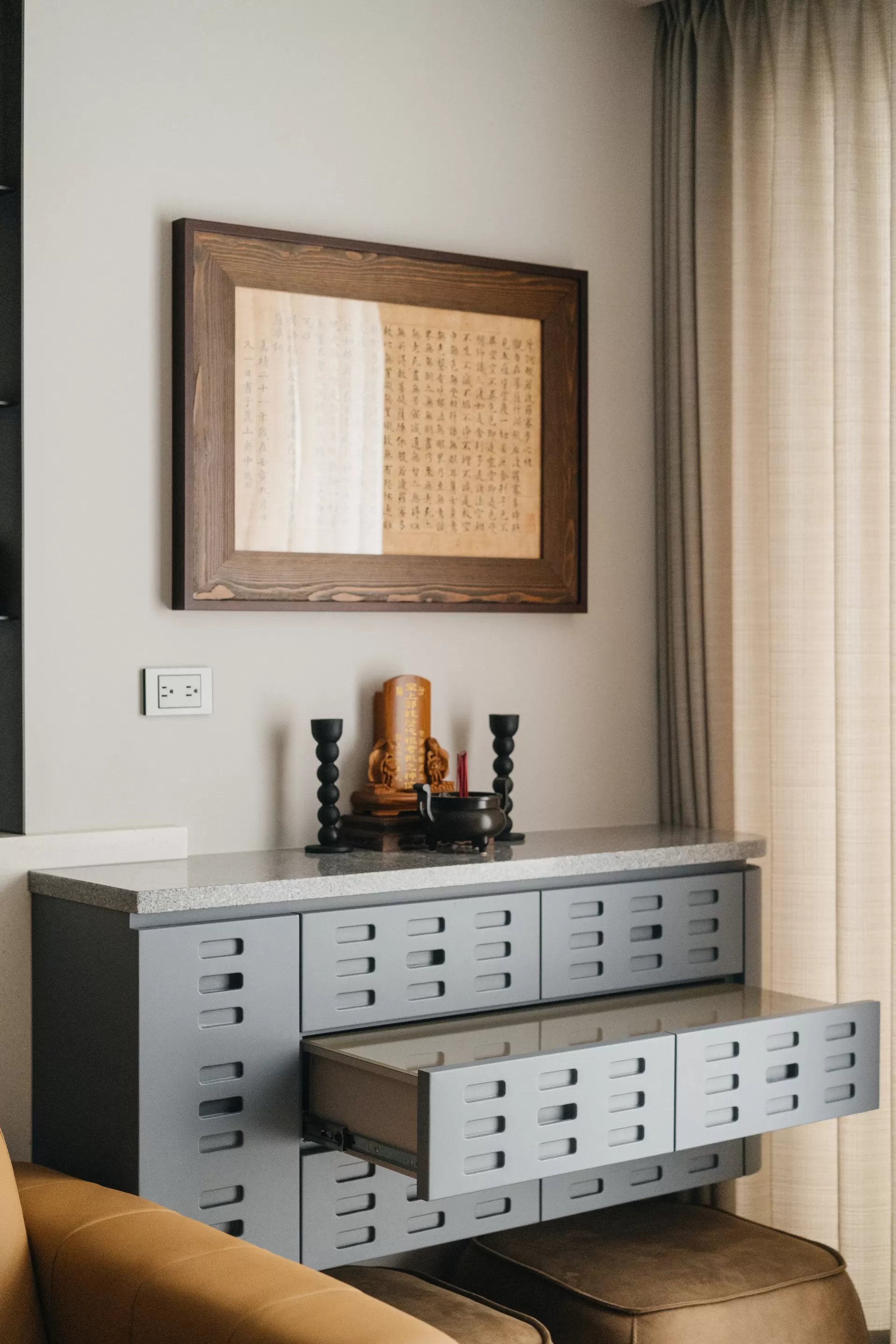 廓形,點線面構築的生活空間。鐵件、深淺色木作、人造石、大板磚...多元材質的交織為空間帶來了感官上的動態聯想。當代形式的祭壇,讓新舊兩代更輕鬆地展開對話。而臥室中的深色木板和橙色皮質床頭則為空間持續增添了動態的氣息。